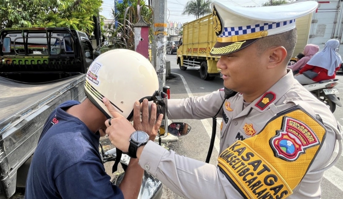 Sebagai bagian dari kegiatan tersebut, jajaran Satlantas Polresta Malang Kota membagikan 100 helm gratis kepada pengendara roda dua di sejumlah titik strategis Kota Malang.