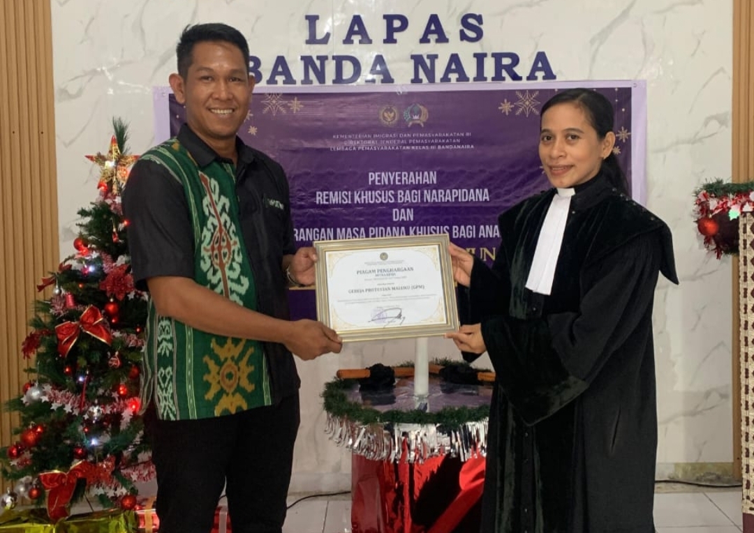 Surat Keputusan Remisi dari Kementerian Imigrasi dan Pemasyarakatan melalui Direktorat Jenderal Pemasyarakatan diserahkan langsung oleh Kepala Lapas Bandanaira, Mikha, di sela perayaan Natal di Aula Lapas, Kamis (25/12). Mikha hadir bersama bersama Kepala Subseksi Admisi dan Orientasi, Abdul Madjid Ohorella, dan Ketua Majelis Jemaat Gereja Protestan Maluku (GPM) Naira Klasik Pulau-Pulau Banda, Pdt. Juliet Noya.
