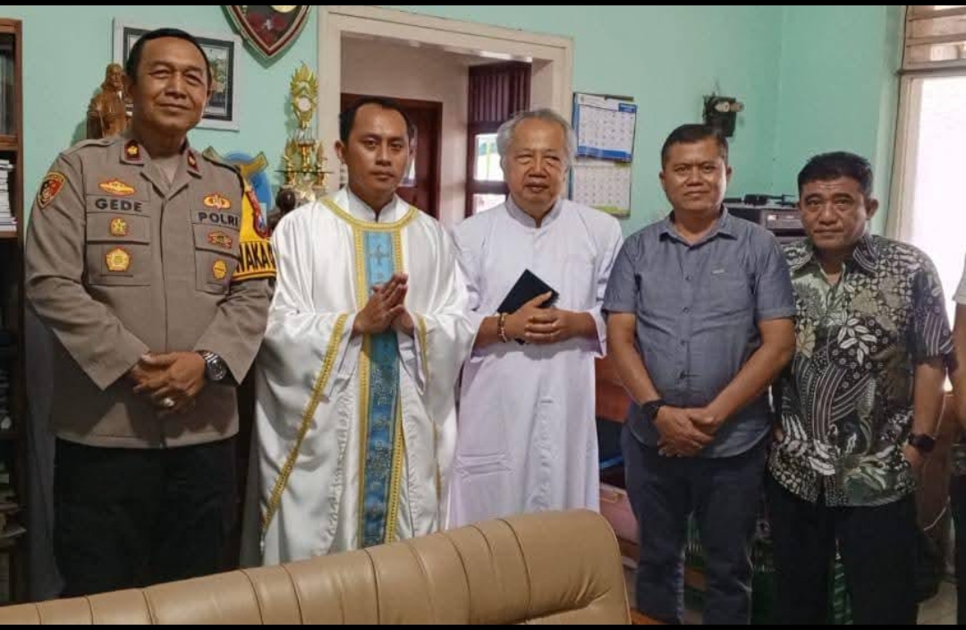 Kehadiran Wakapolres disambut langsung oleh Pemimpin Umat Katolik Romo RD Bonifasius Hudiono, didampingi Romo RD Agustinus Galuh Wicaksono, serta Viktor Novan Haryanto dan Primus Segu, Ketua Panitia Natal 2025.